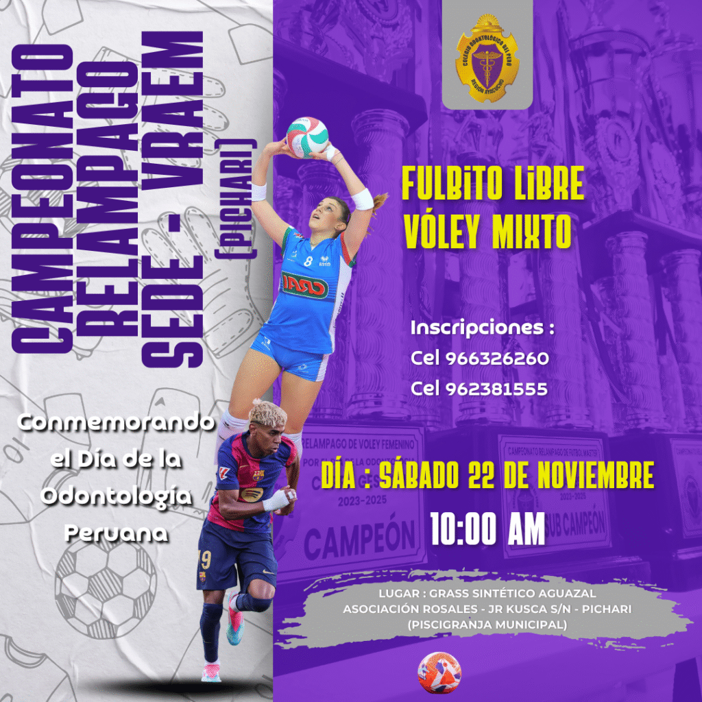 En conmemoración al Día de la Odontología Peruana, el Colegio Odontológico del Perú – Región Ayacucho invita cordialmente a todos los cirujano dentistas colegiados y habilitados de la región a participar en el Campeonato Relámpago Sede VRAEM – Pichari, una jornada deportiva orientada a fortalecer los lazos de confraternidad, integración y bienestar entre los miembros de la orden profesional.