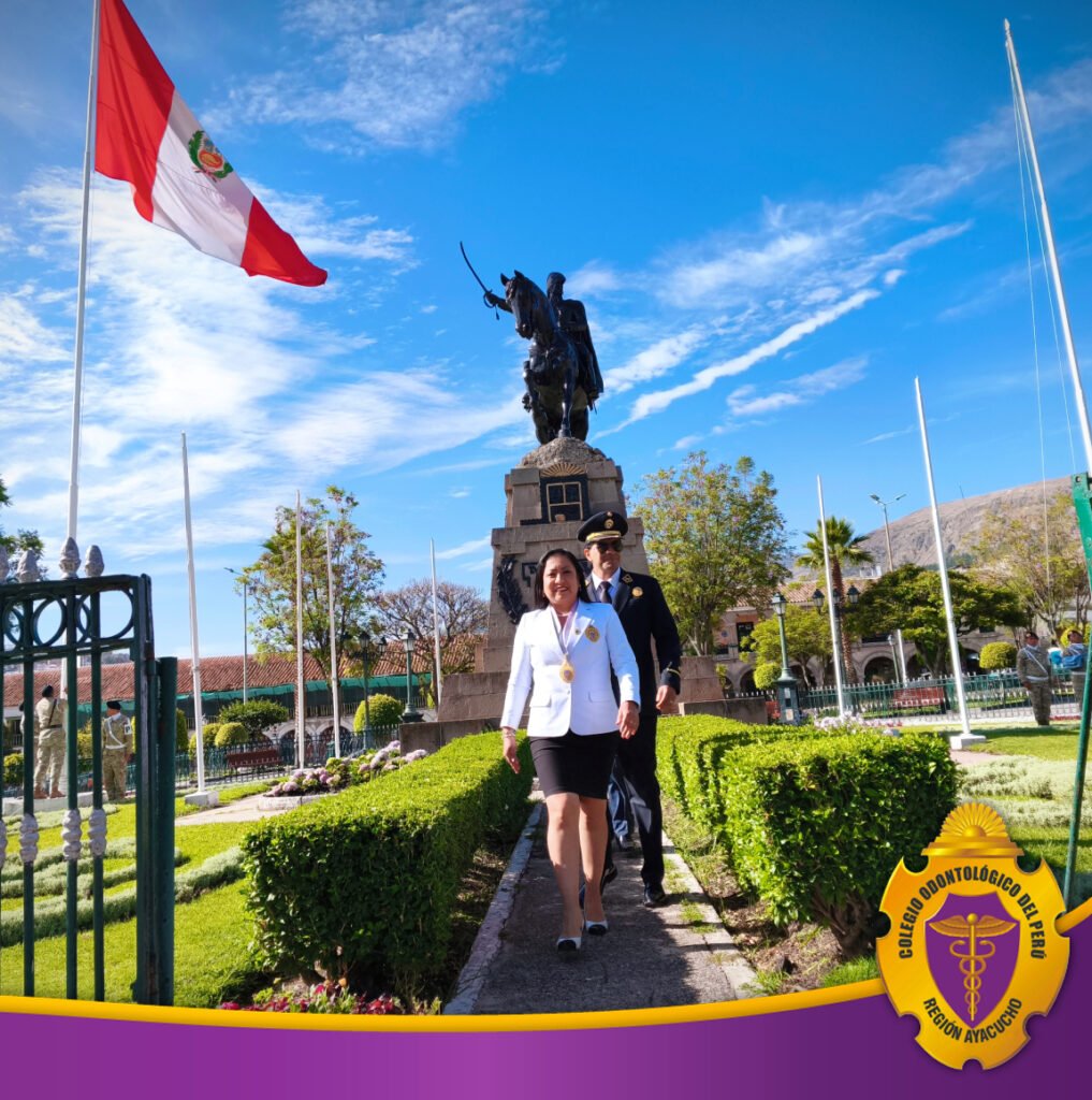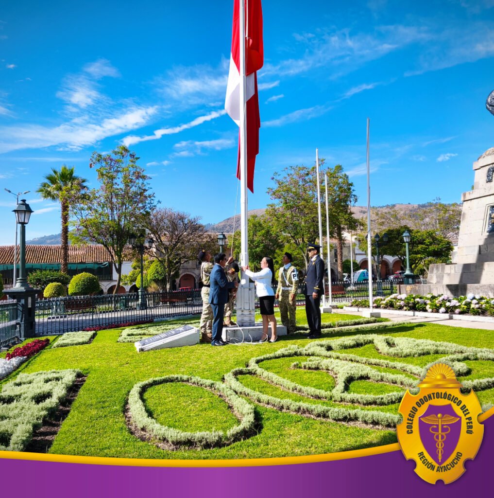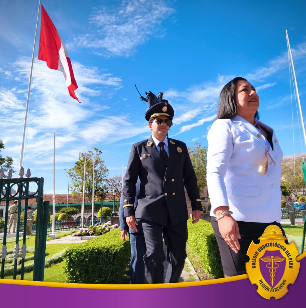 Durante la ceremonia, la decana del COP – Ayacucho, Dra. Cristina Ivette Garibay Bendezu, en representación de todos los profesionales odontólogos de la región, tuvo el alto honor de izar la Bandera Nacional. Este gesto solemne simboliza el compromiso institucional con los valores de servicio, responsabilidad y respeto hacia el país y hacia la comunidad ayacuchana.