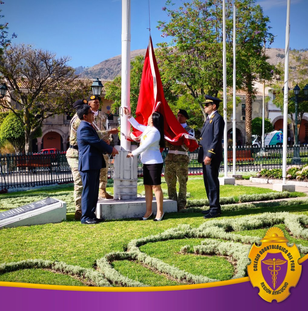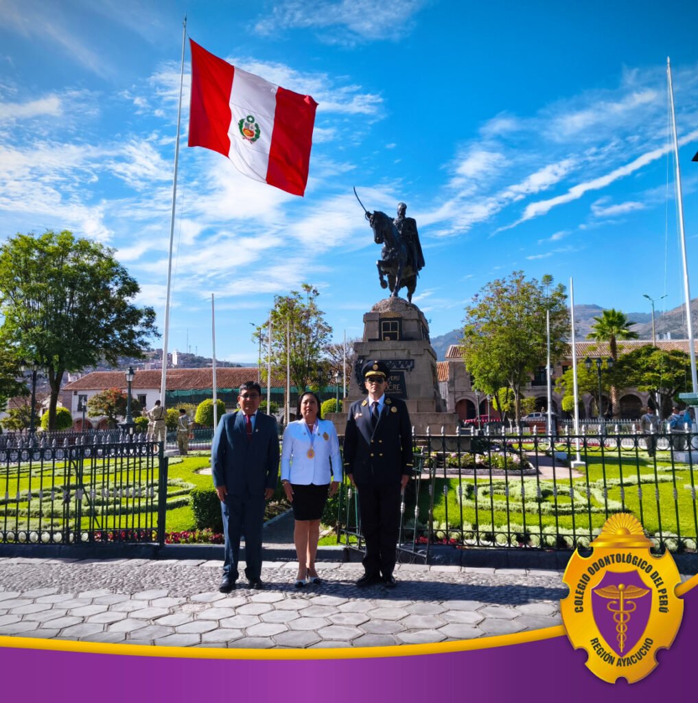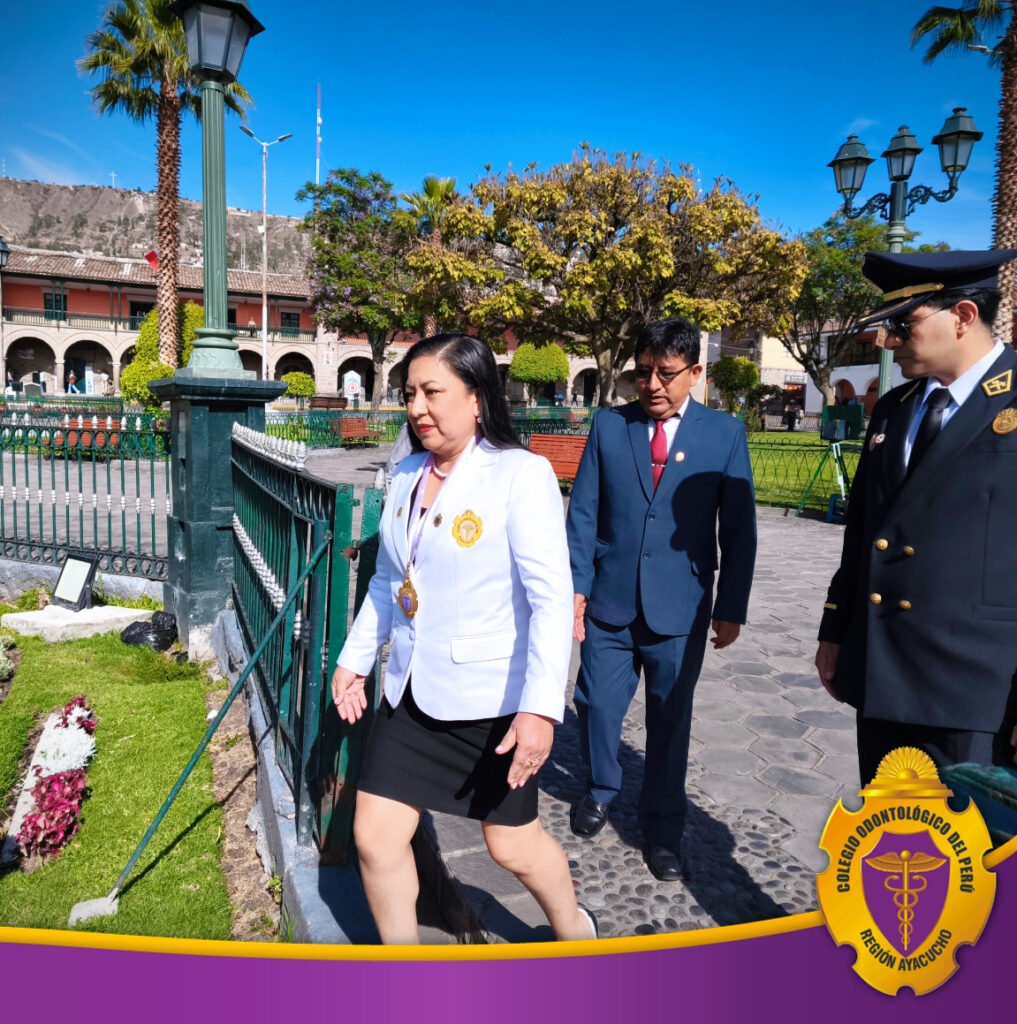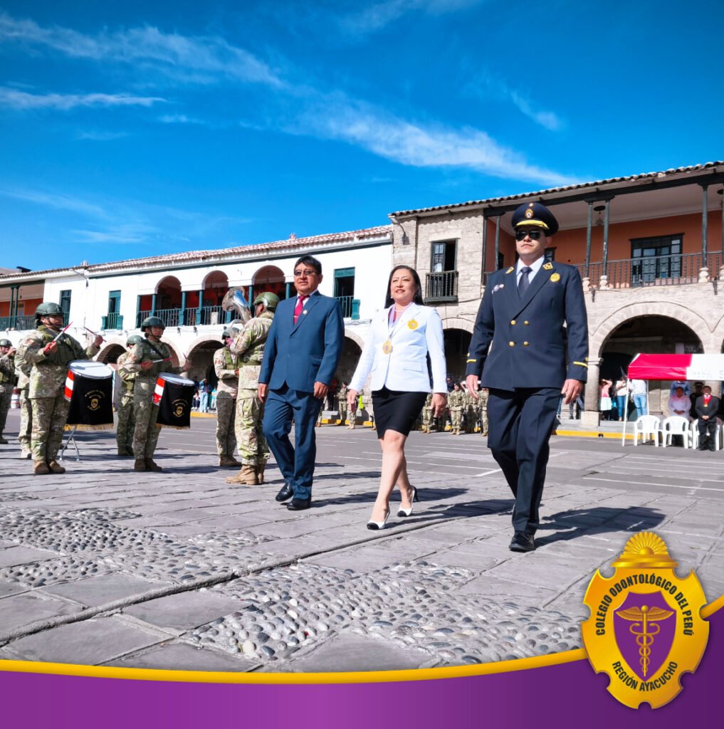 Durante la ceremonia, la decana del COP – Ayacucho, Dra. Cristina Ivette Garibay Bendezu, en representación de todos los profesionales odontólogos de la región, tuvo el alto honor de izar la Bandera Nacional. Este gesto solemne simboliza el compromiso institucional con los valores de servicio, responsabilidad y respeto hacia el país y hacia la comunidad ayacuchana.