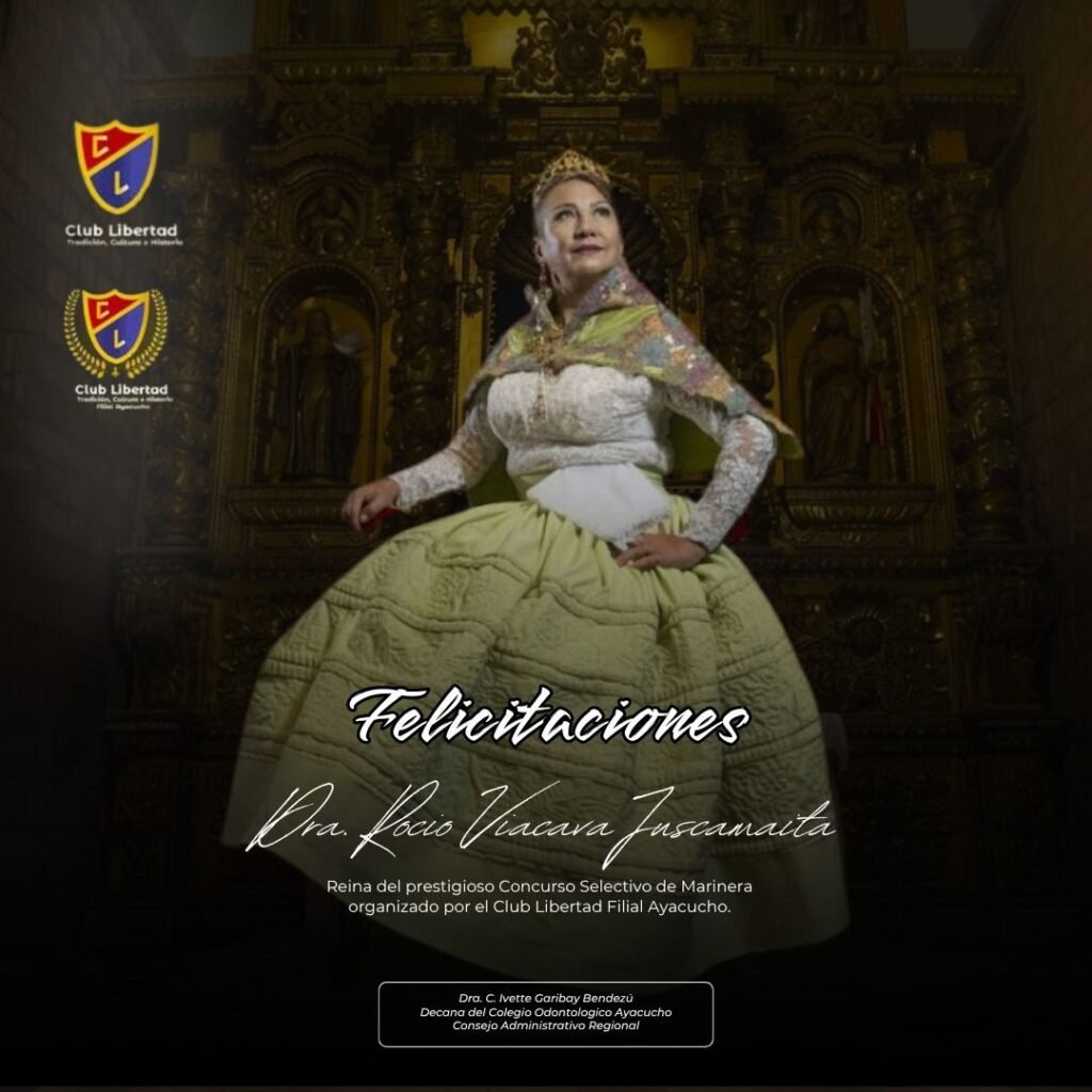 El Colegio Odontológico del Perú – Región Ayacucho expresa su más cordial saludo y felicitación a la Dra. Rocio Beatriz Viacava Juscamaita, distinguida integrante de nuestra orden profesional, por haber sido coronada Reina del Concurso Selectivo de Marinera, certamen organizado por el Club Libertad Filial Ayacucho y considerado uno de los espacios más representativos de promoción y difusión de nuestra danza nacional.