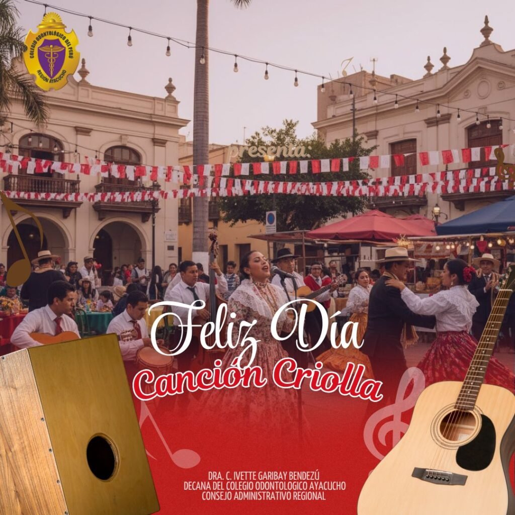 El Colegio Odontológico del Perú – Región Ayacucho se une a la conmemoración del Día de la Canción Criolla, una fecha que rinde homenaje al alma musical de nuestro país, expresada en cada vals, festejo y marinera que representan la identidad y el sentimiento del pueblo peruano.