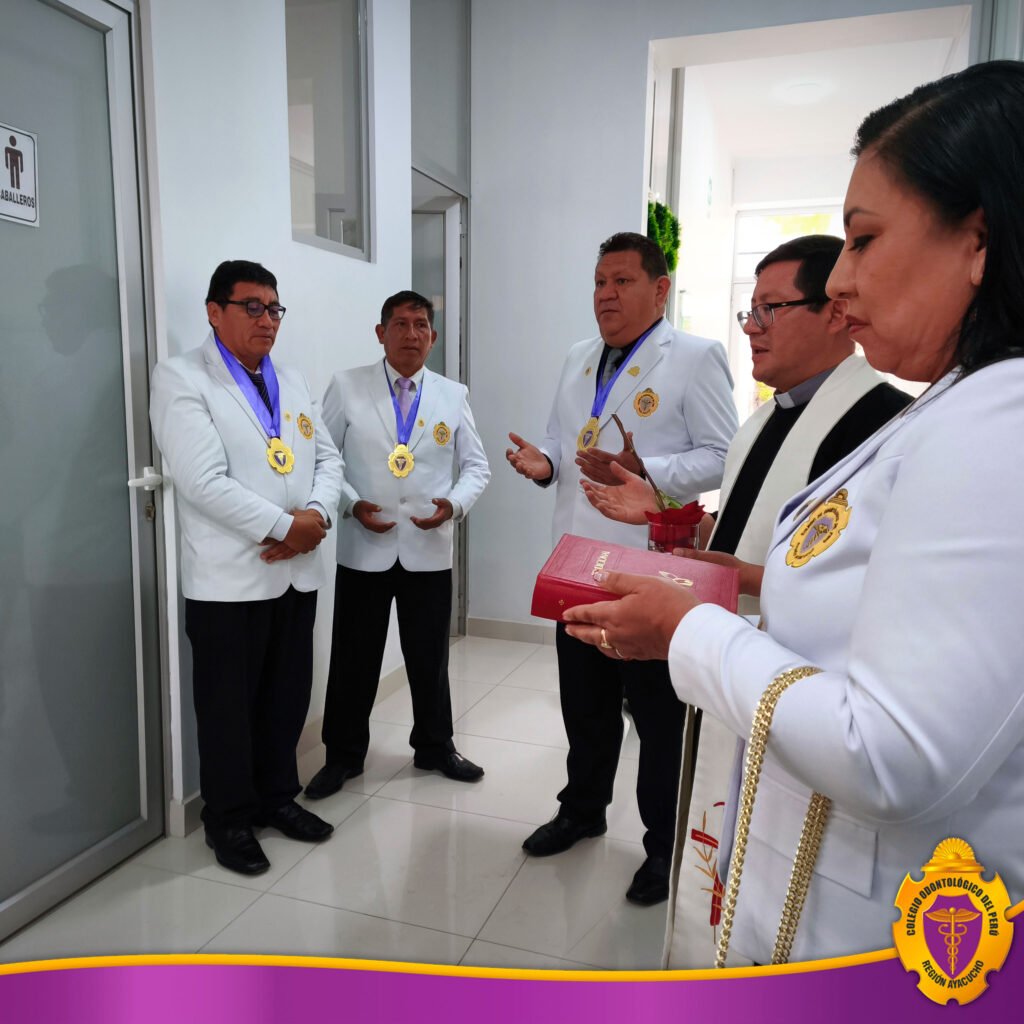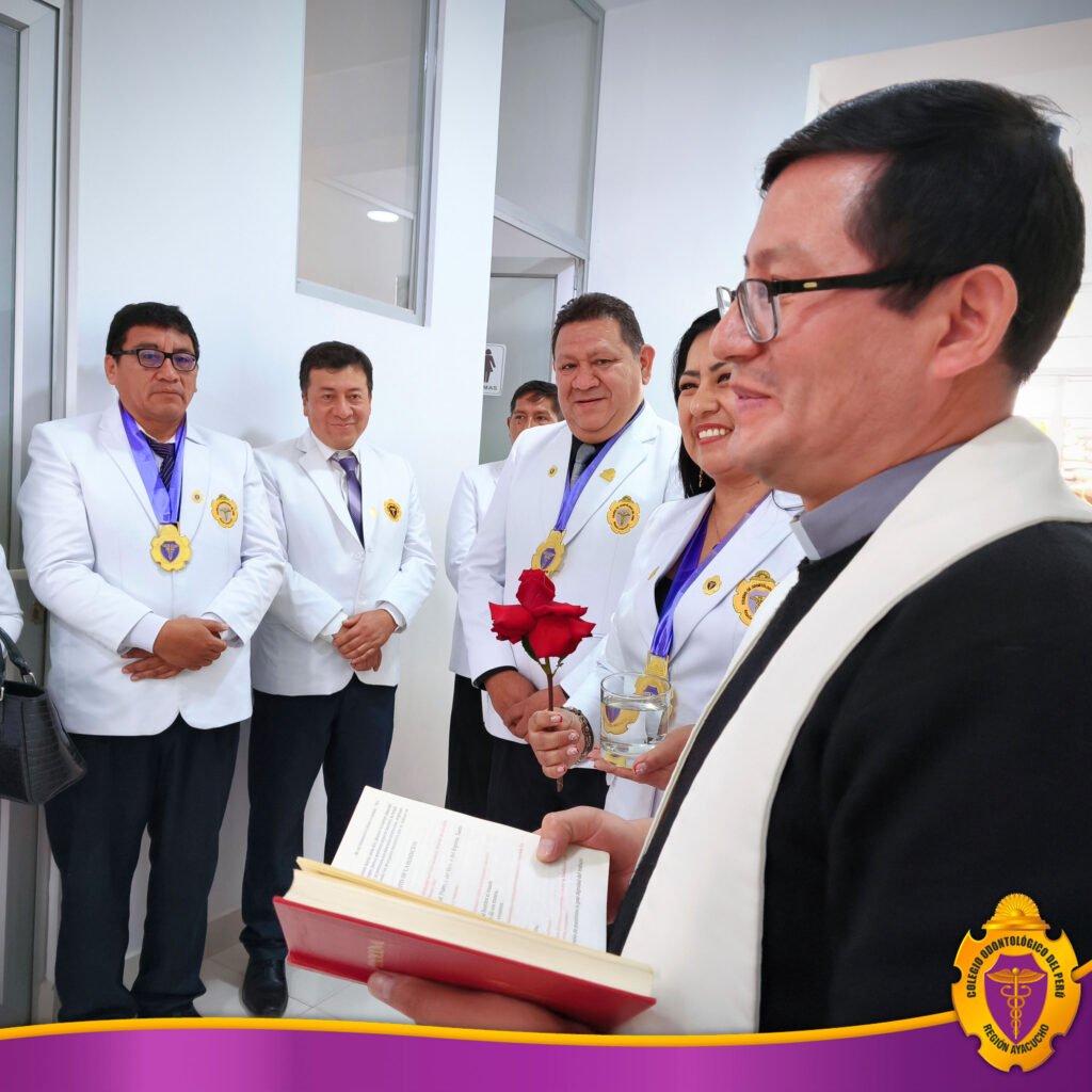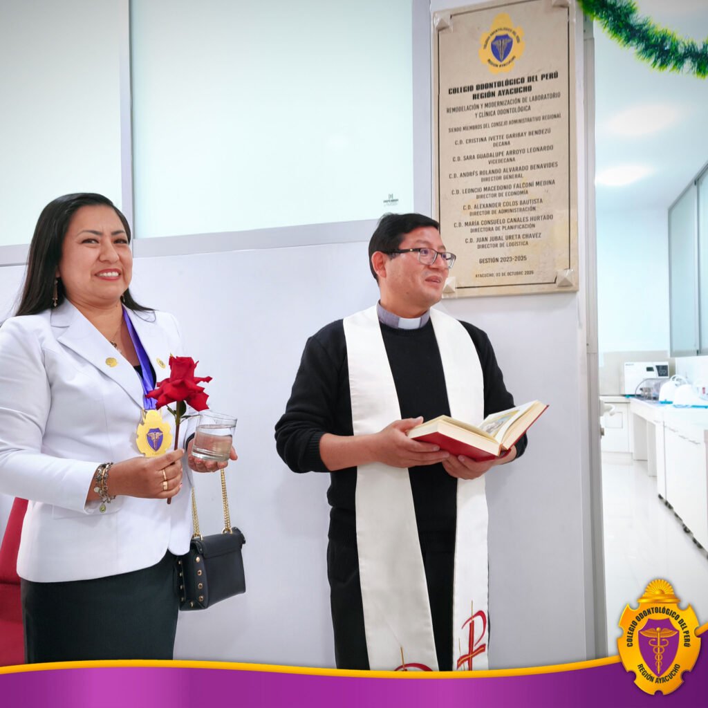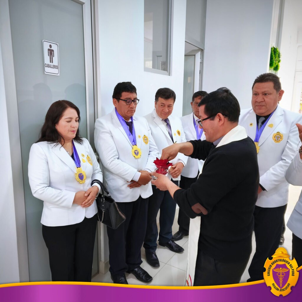 Acto seguido, se realizó la develación de la placa oficial del Colegio Odontológico del Perú – Región Ayacucho, ceremonia que contó con la presencia y bendición del padre invitado. El sacerdote también bendijo las instalaciones institucionales, pidiendo por la continuidad del trabajo responsable y comprometido en beneficio de todos los colegiados.