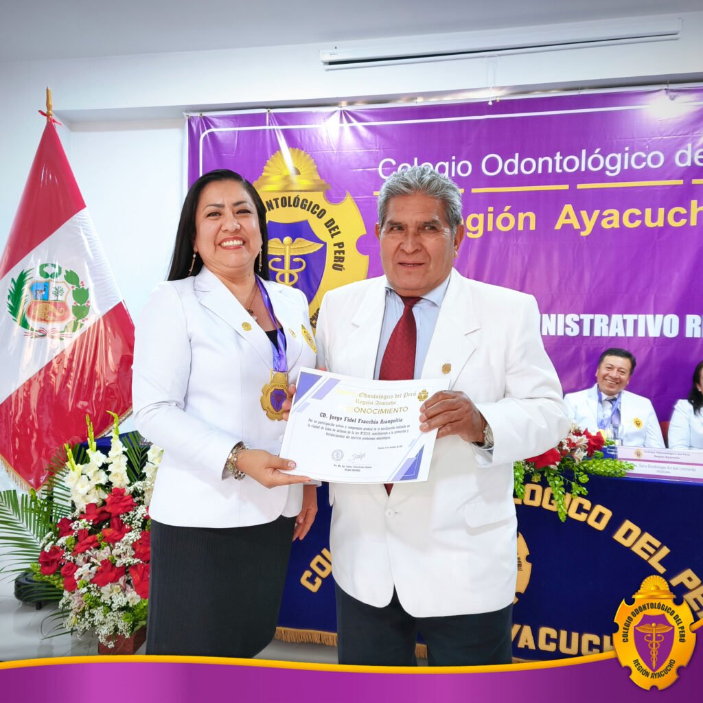 La programación continuó con la ceremonia protocolar, en la que se reconoció a distintos colegas por sus años de servicio profesional, por acciones destacadas en favor de la salud pública y por su aporte al prestigio de la odontología ayacuchana. Este homenaje resaltó el esfuerzo, perseverancia y dedicación de profesionales que, desde distintos espacios, contribuyen a fortalecer la imagen del cirujano dentista en la región.