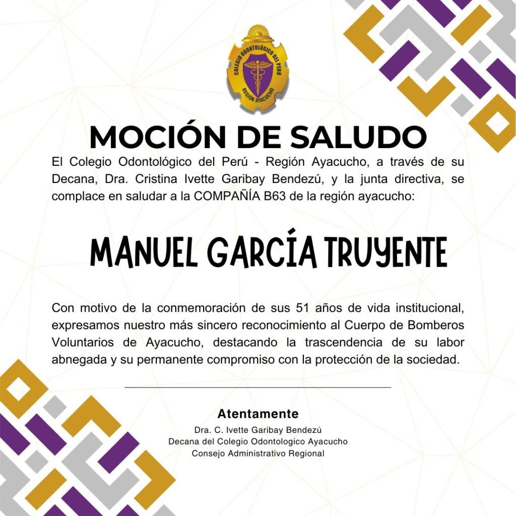 El Colegio Odontológico del Perú – Región Ayacucho expresa su más profundo reconocimiento y saludo institucional al Cuerpo General de Bomberos Voluntarios del Perú – Compañías de Ayacucho, en conmemoración de su 51.º aniversario de vida institucional.