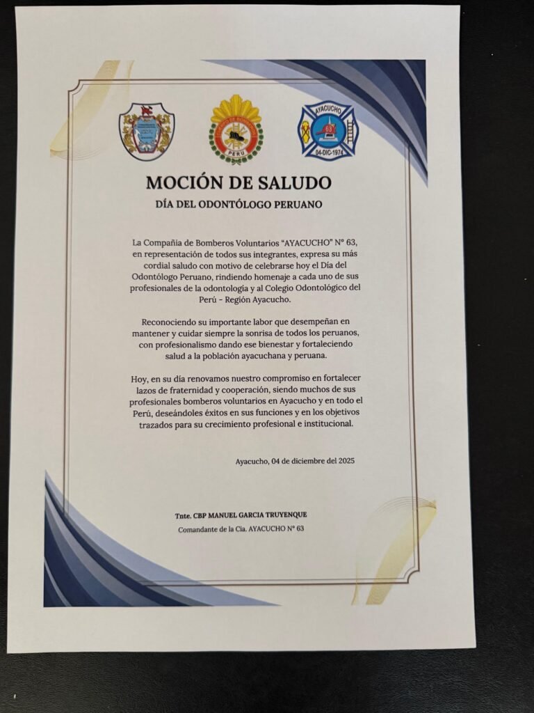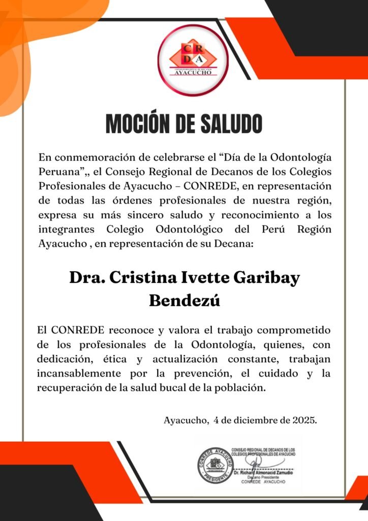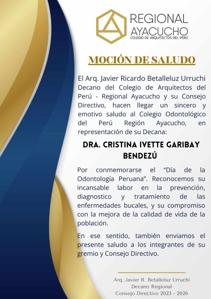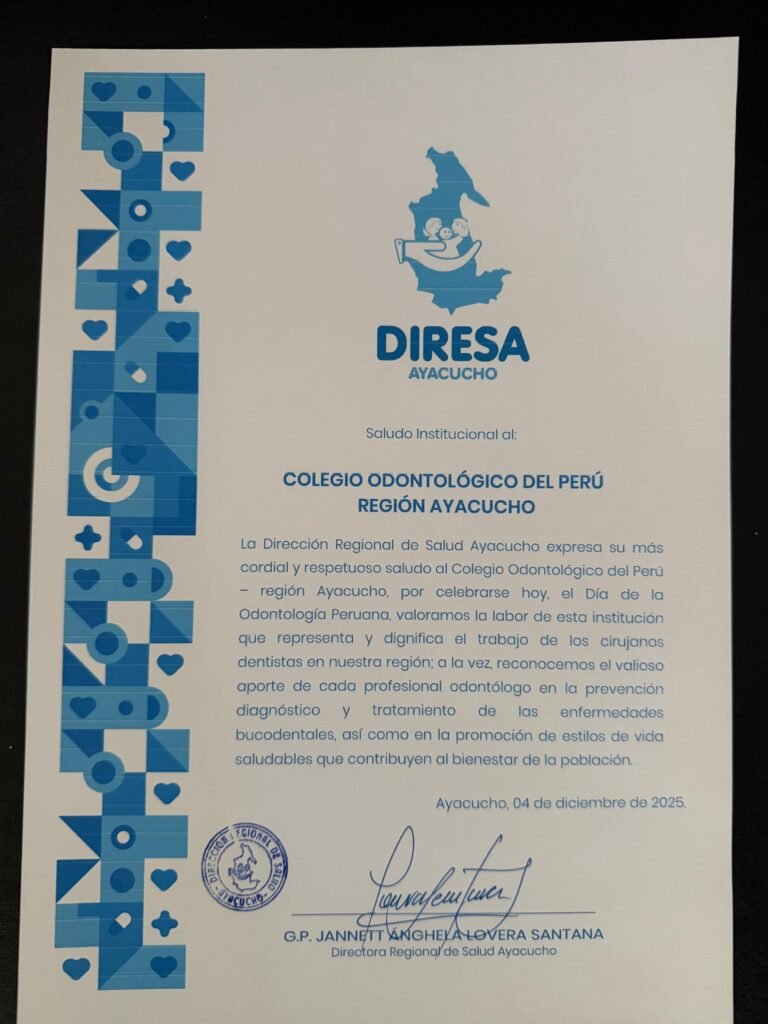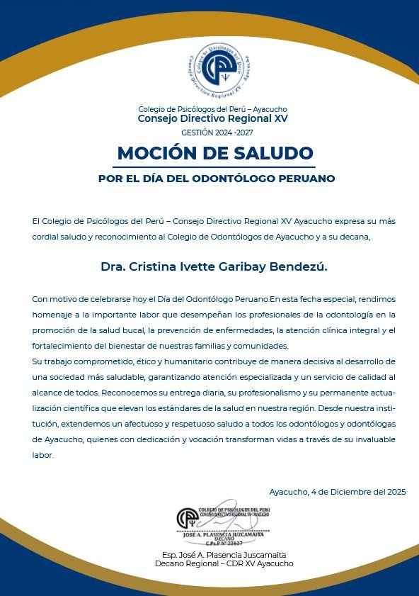 El Colegio Odontológico del Perú – Región Ayacucho expresa su más profundo y sincero agradecimiento a todas las instituciones públicas y privadas, autoridades, organizaciones profesionales y colegas que hicieron llegar sus mociones de saludo con motivo del Día de la Odontología Peruana.