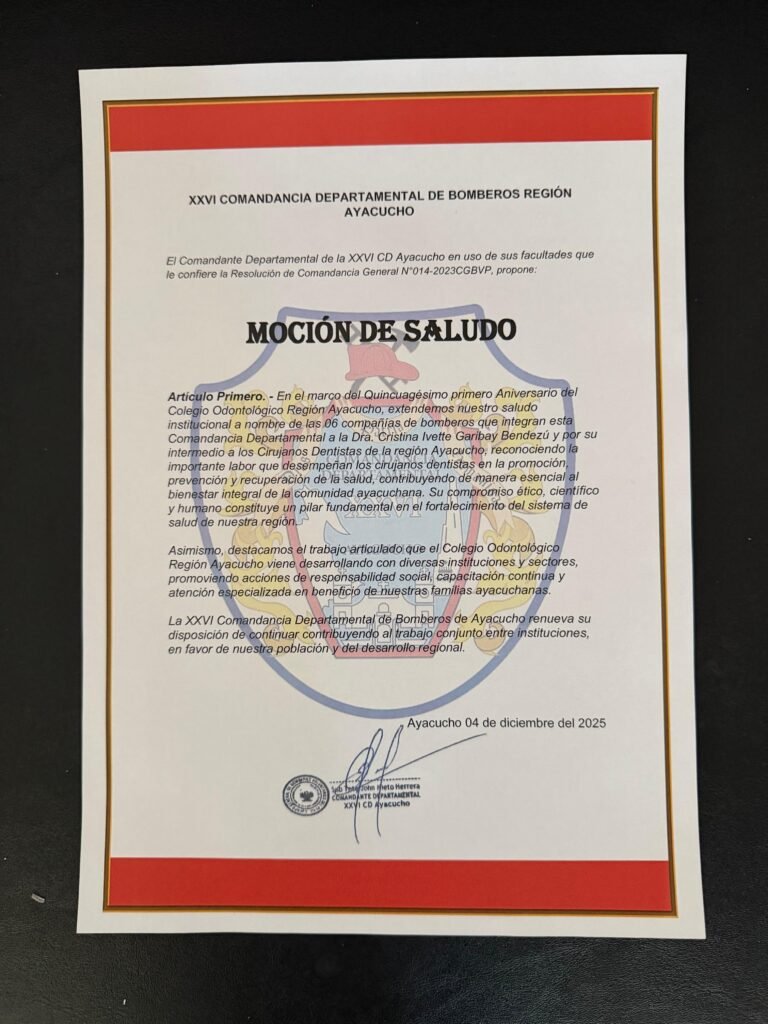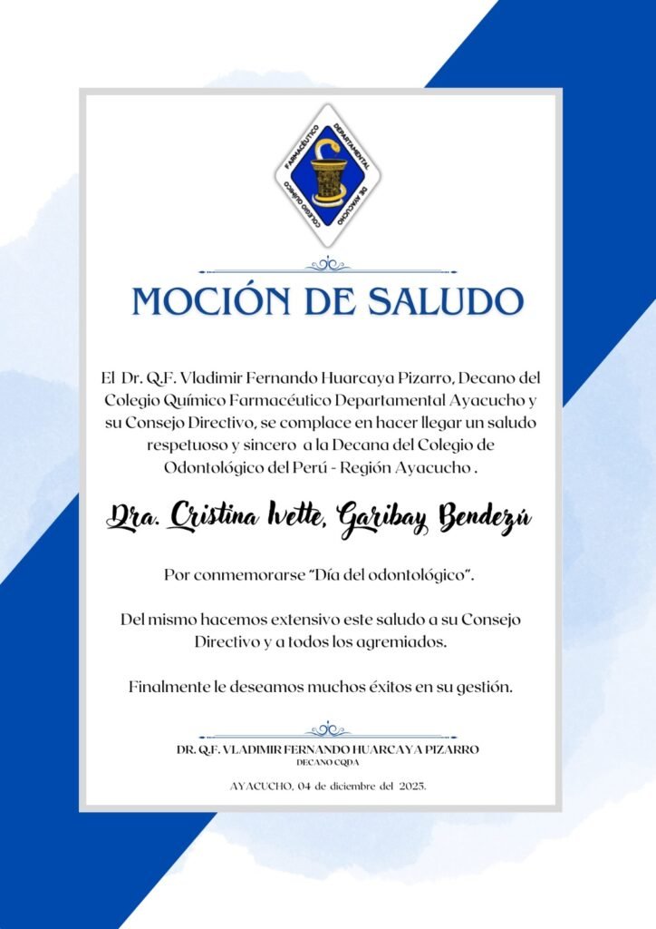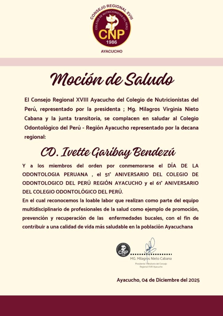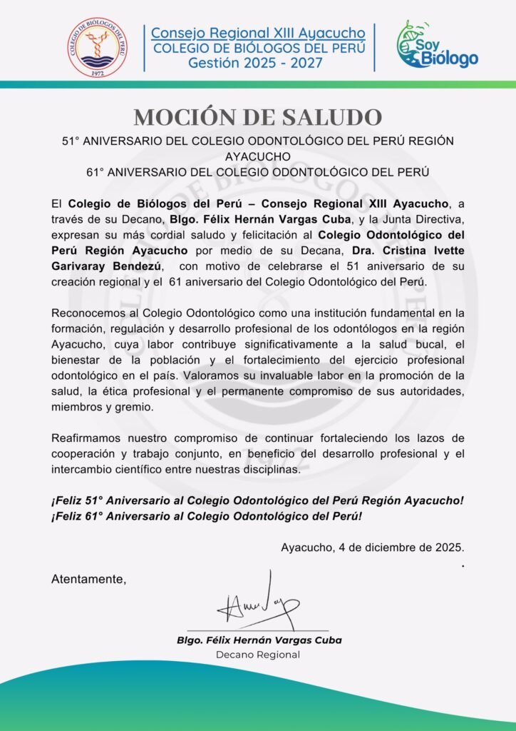 El Colegio Odontológico del Perú – Región Ayacucho expresa su más profundo y sincero agradecimiento a todas las instituciones públicas y privadas, autoridades, organizaciones profesionales y colegas que hicieron llegar sus mociones de saludo con motivo del Día de la Odontología Peruana.