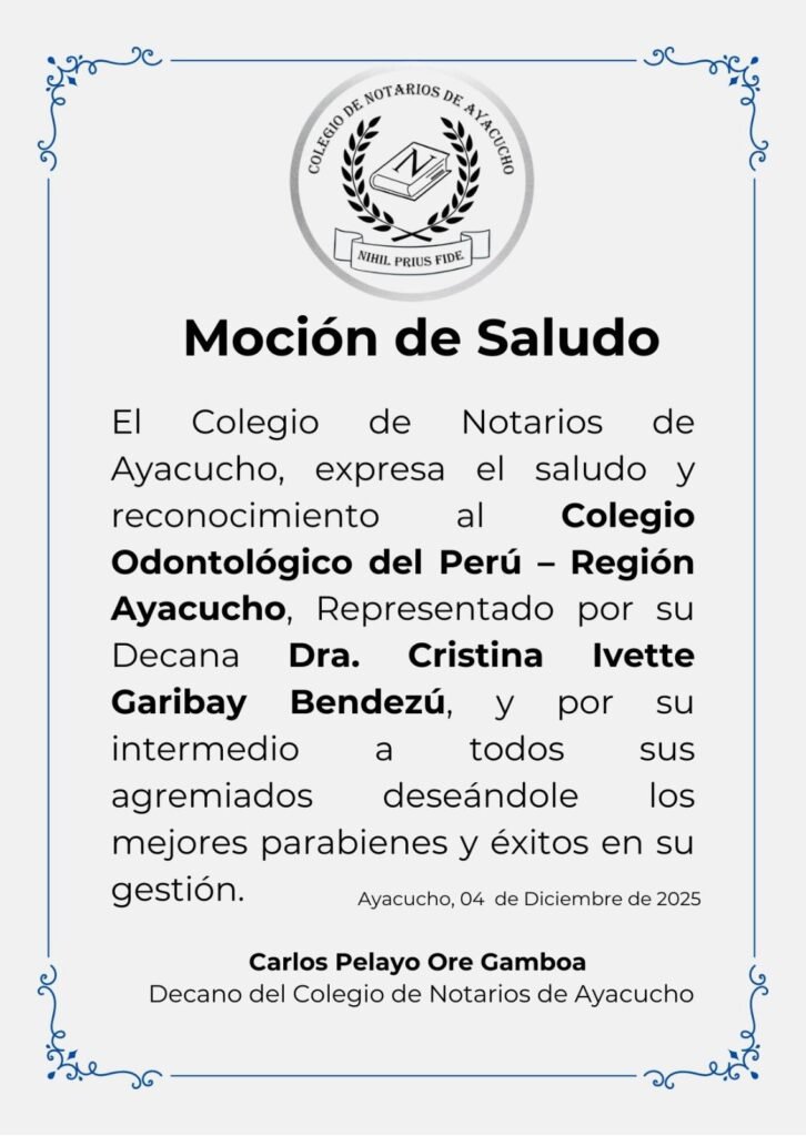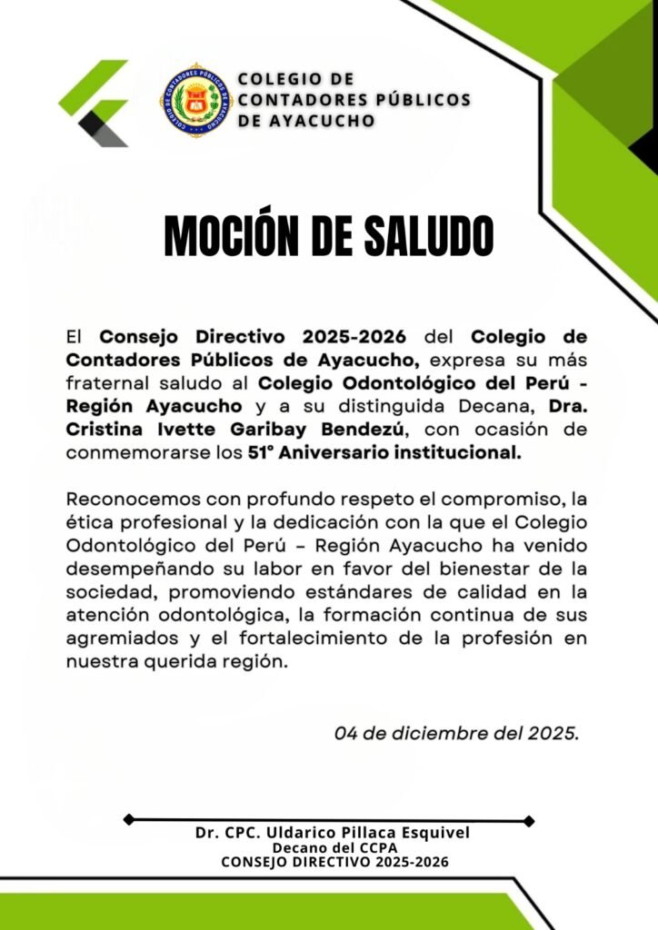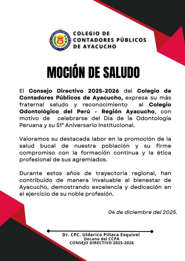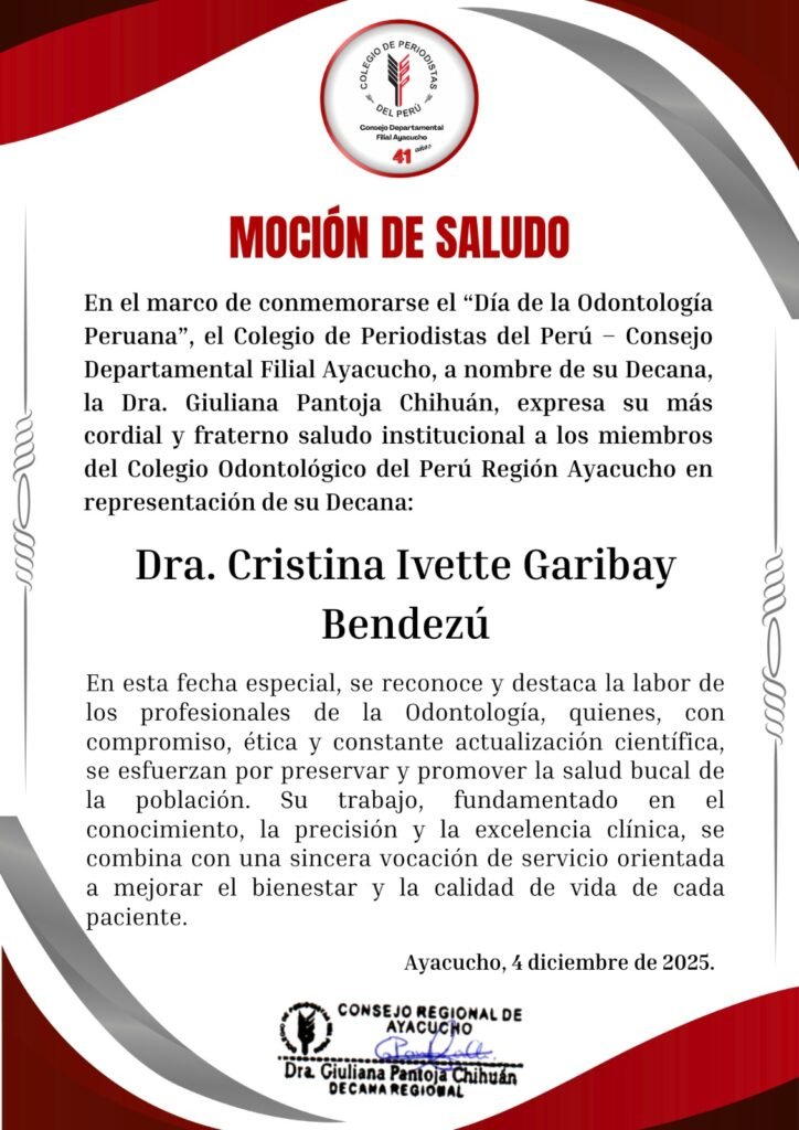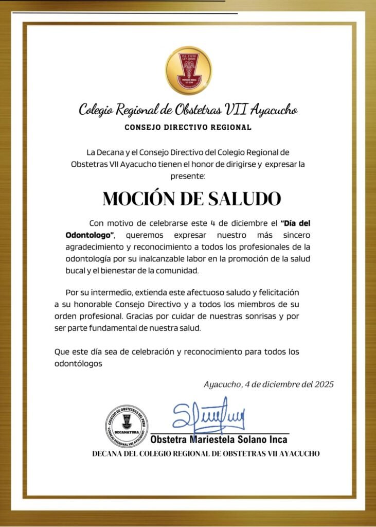 Cada expresión de reconocimiento refleja no solo el aprecio hacia nuestra labor institucional, sino también el valor que la sociedad otorga al trabajo comprometido de los Cirujanos Dentistas que ejercen en nuestra región. Estos mensajes fortalecen nuestro espíritu profesional y nos motivan a continuar impulsando acciones en beneficio de la salud oral y del desarrollo de la odontología ayacuchana.