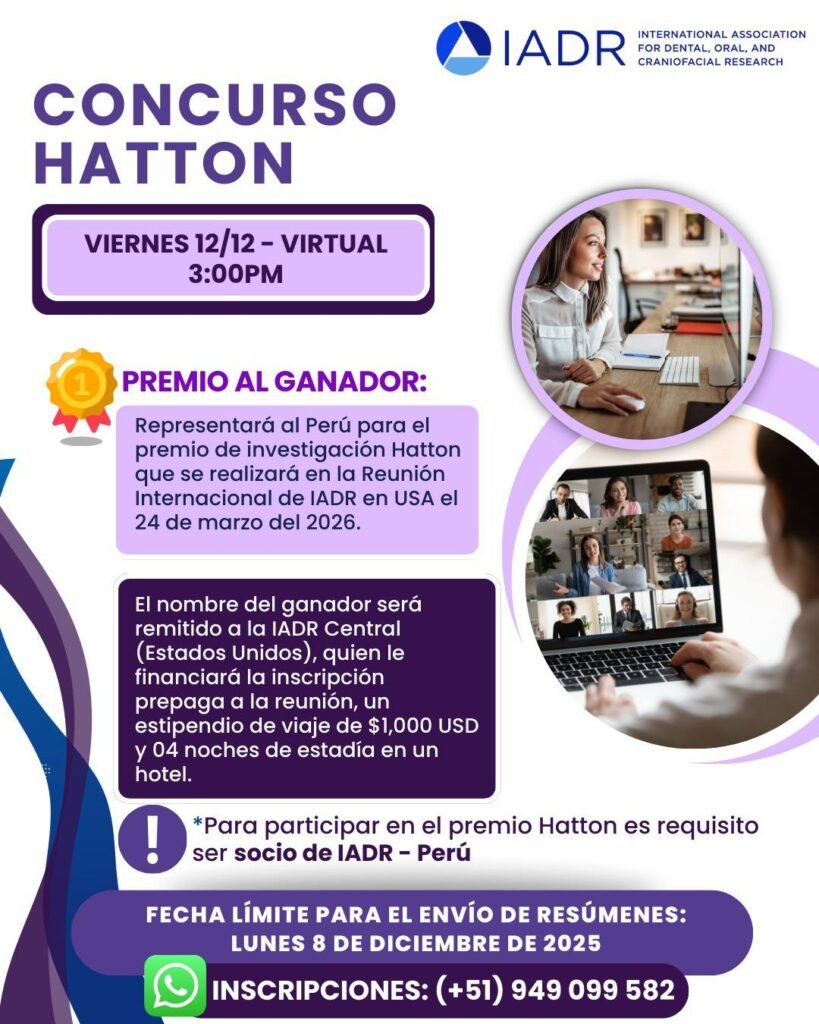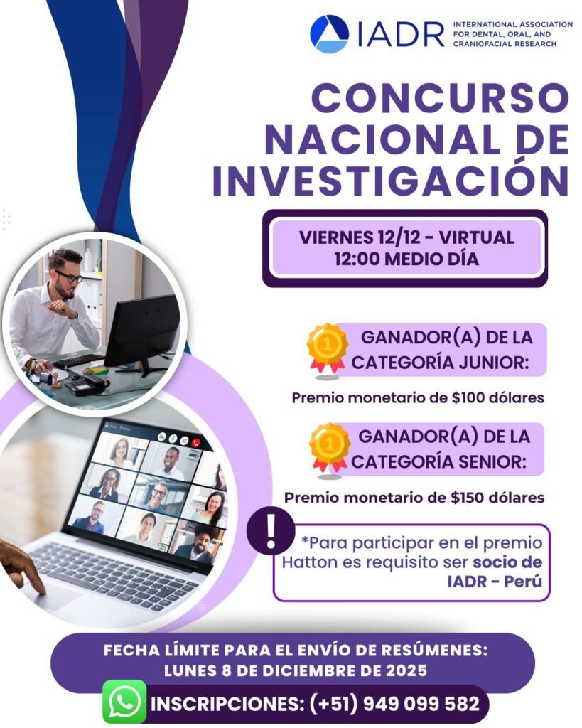 Asimismo, se comunica que el lunes 8 de diciembre es la fecha límite para la inscripción y envío de trabajos de investigación tanto para el Concurso Hatton como para el Concurso Nacional de Investigación. Los interesados pueden remitir sus trabajos al correo oficial divisionperu.iadr@gmail.com o comunicarse mediante WhatsApp al número (+51) 949 099 582 para recibir mayor información.