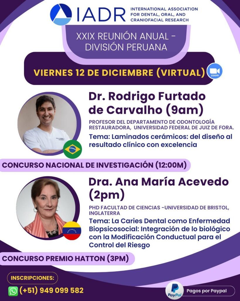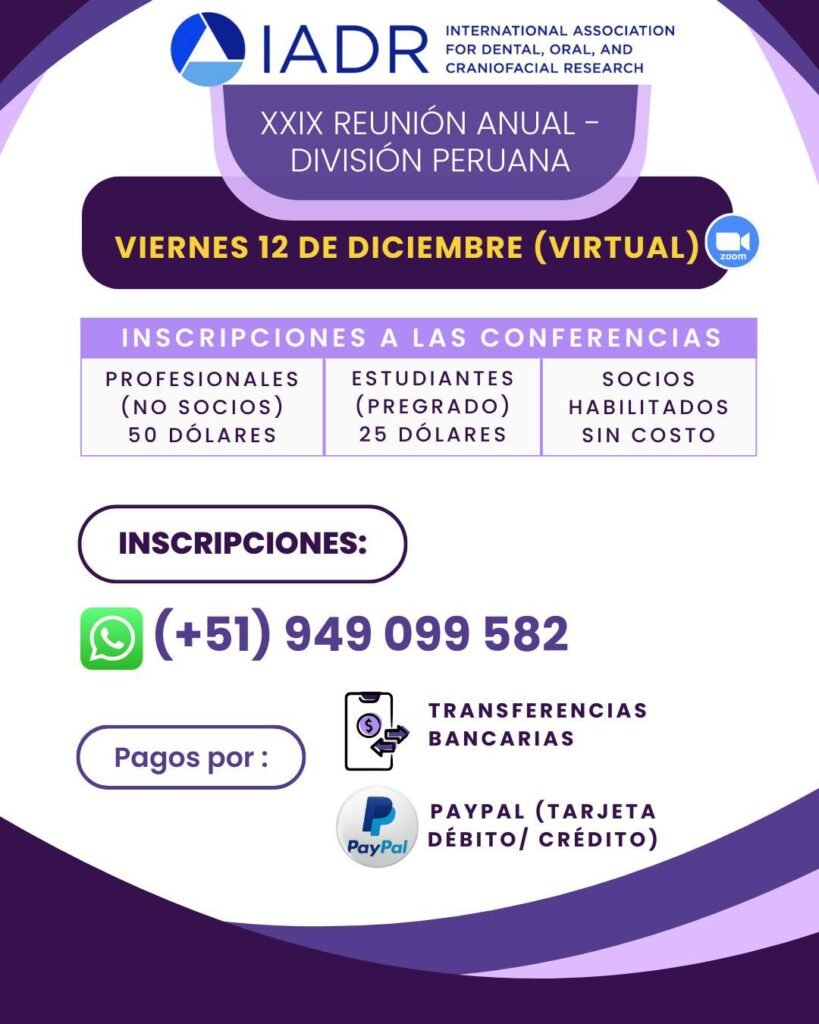 El Colegio Odontológico del Perú – Región Ayacucho extiende una cordial invitación a todos los profesionales y estudiantes de odontología a participar en la XXIX Reunión Anual de la International Association for Dental Research (IADR) – División Perú, a realizarse el día 12 de diciembre en modalidad virtual mediante la plataforma Zoom.