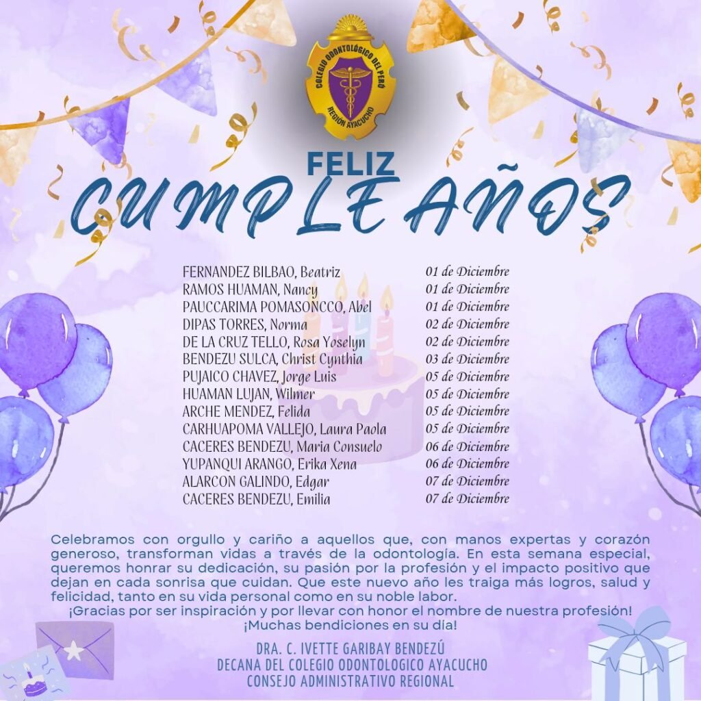 El Colegio Odontológico del Perú – Región Ayacucho expresa su saludo fraterno a todos los cirujanos dentistas de nuestra orden que celebran su cumpleaños durante la presente semana del mes de diciembre. Este reconocimiento busca destacar la importancia del trabajo que cada uno de nuestros colegas realiza en favor de la salud bucal de la población ayacuchana, así como su compromiso permanente con el ejercicio ético y profesional de la odontología.