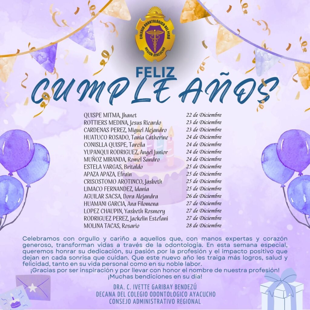 A nombre de la Junta Directiva y del Colegio Odontológico del Perú – Región Ayacucho, les deseamos un nuevo año de vida colmado de salud, éxitos profesionales, bienestar personal y renovadas motivaciones para continuar ejerciendo la odontología con excelencia y humanidad.