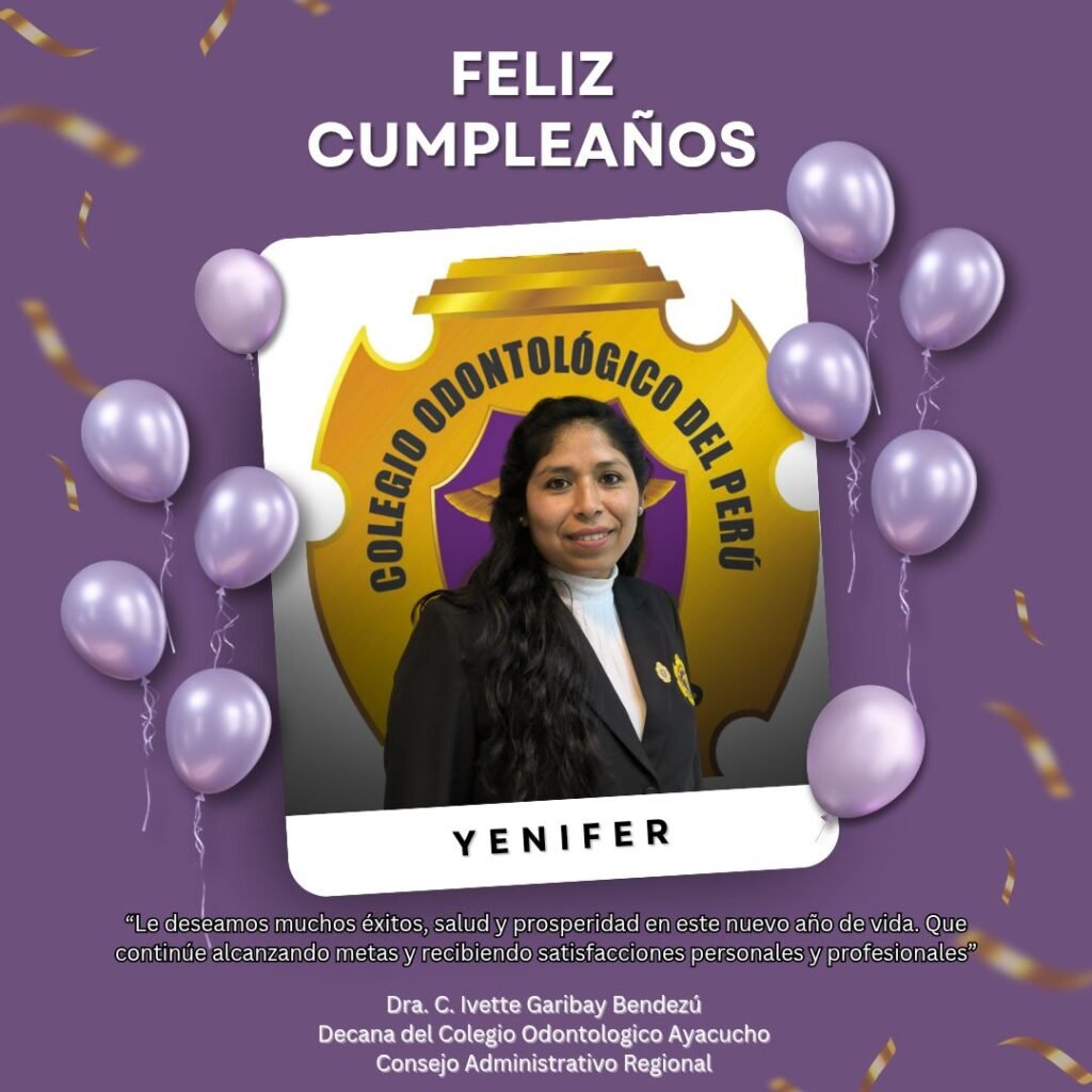 El Colegio Odontológico del Perú – Región Ayacucho expresa su cordial saludo y reconocimiento a la señorita Yenifer Valenzuela con motivo de su cumpleaños, destacando la importante labor que desempeña dentro de nuestra institución. Su dedicación, calidez en el trato y constante compromiso contribuyen significativamente al adecuado funcionamiento del Colegio y al fortalecimiento de cada una de las actividades que desarrollamos.